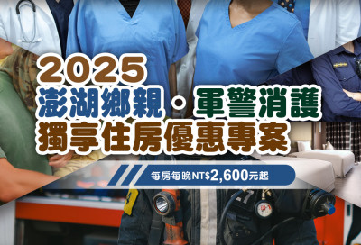 致敬最辛勞的前線守護者,以及一直支持家鄉的澎湖鄉親,獻上專屬的獨家住房禮遇!原定價NT$12,500的豪華雙床客房,專案價每晚僅NT$2,600元起,讓您安心休憩、盡享假期時光。