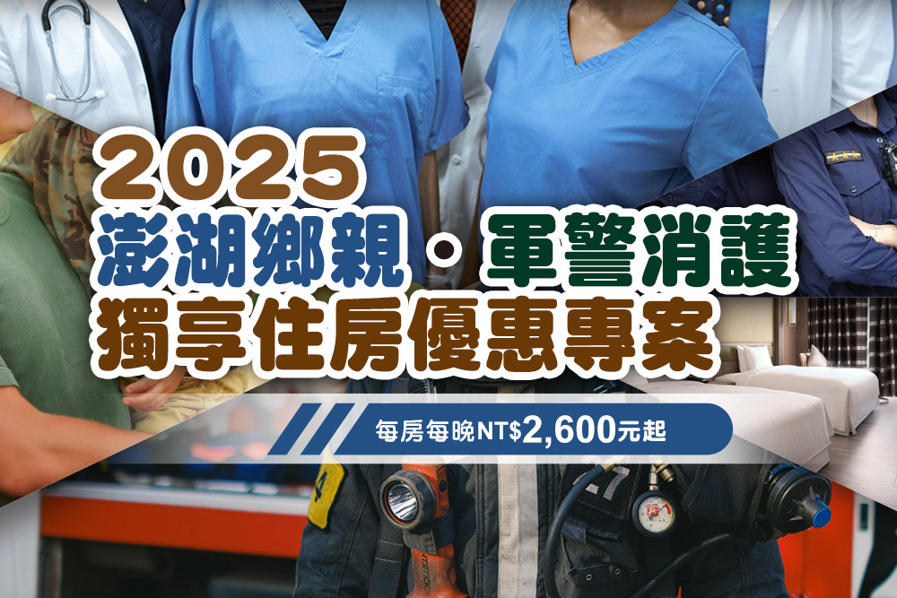 澎湖福朋喜來登酒店推出「澎湖鄉親.軍警消護獨享」住房專案,凡身分證字號「X」或戶籍地設籍在澎湖之貴賓,還有總是在前線守衛著我們的軍、警、消、護們入住出示工作服務證皆可享住宿優惠。原價NT$12,500的街景豪華雙床客房,專案價每晚僅NT$2,600元起,讓您以最優惠的價格,享受五星級的住宿體驗。