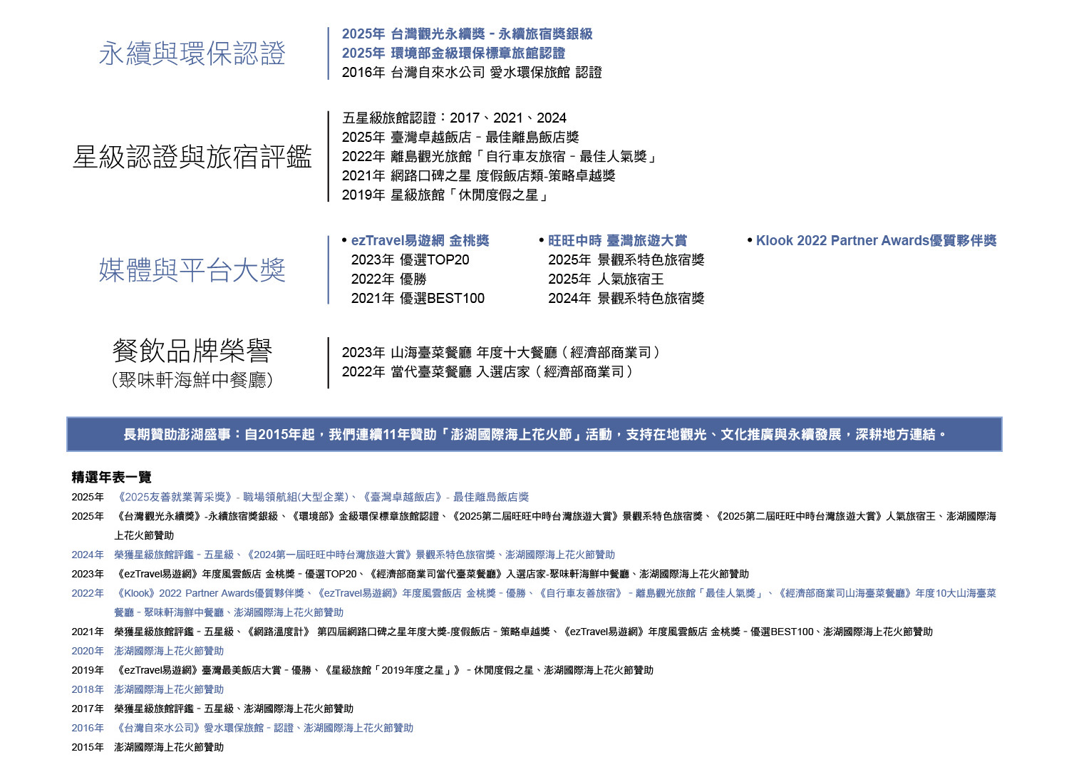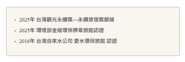 我們始終秉持「永續經營」、「服務至上」、「在地文化融合」的理念,連續多年榮獲各界獎項與認證肯定,致力於成為您旅途中的最佳選擇。