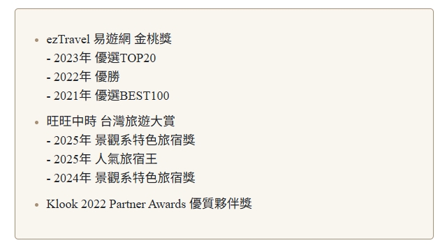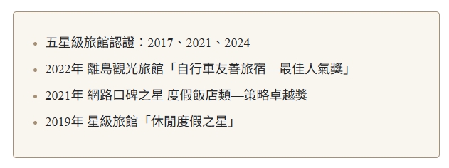 2025年 《 台灣觀光永續獎》—永續旅宿獎銀級、《環境部》金級環保標章旅館認證、《2025第二屆旺旺中時台灣旅遊大賞》景觀系特色旅宿獎、《2025第二屆旺旺中時台灣旅遊大賞》人氣旅宿王、澎湖國際海上花火節贊助